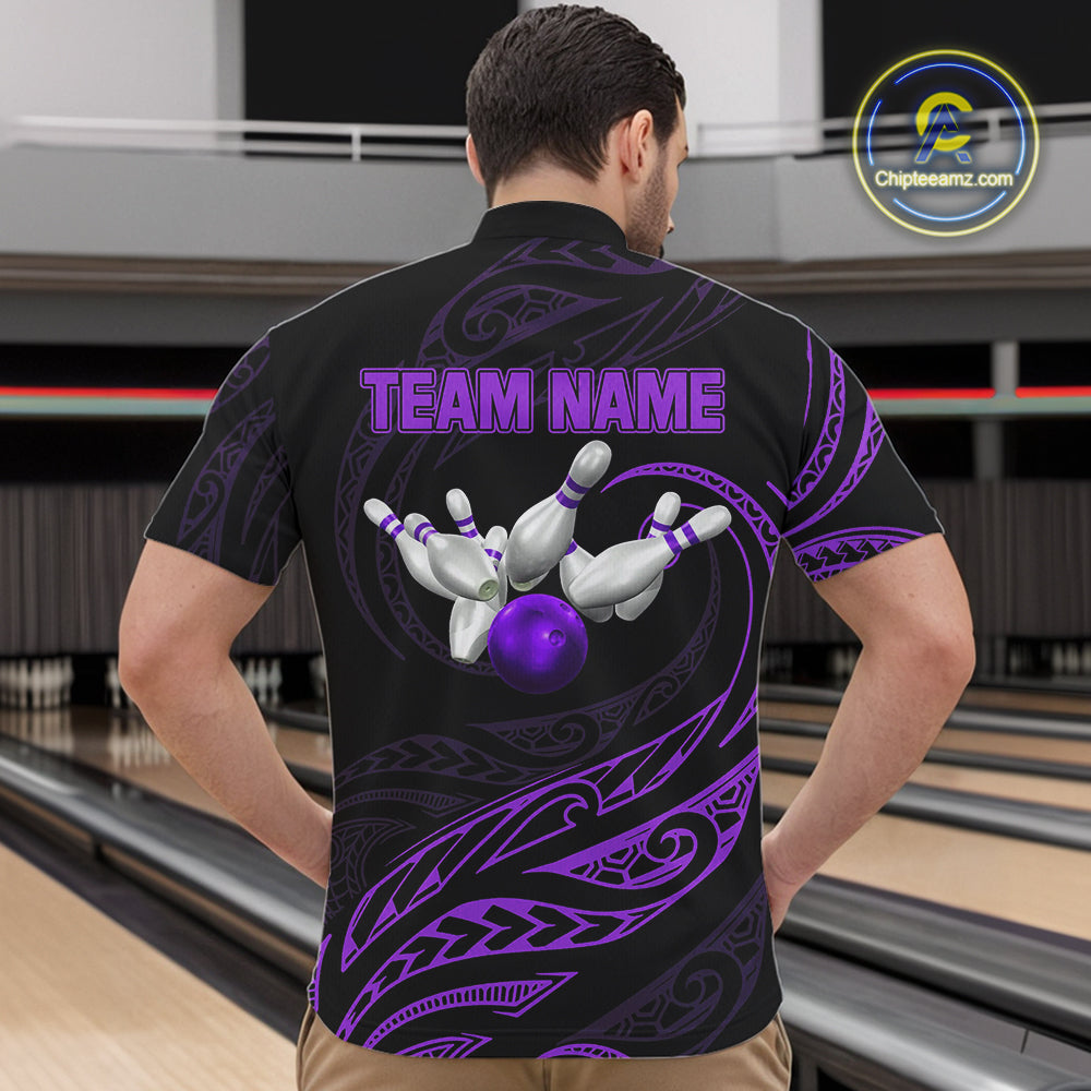 Black and Purple Tribal Pattern Bowling Polo, Quarter Zip shirts For Men Custom Team Bowling Jerseys NQS10486