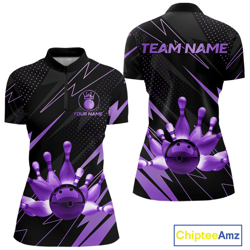 Custom Black and Purple Bowling Polo, Quarter Zip Shirts for Women, Team Bowling League Jersey NQS10894