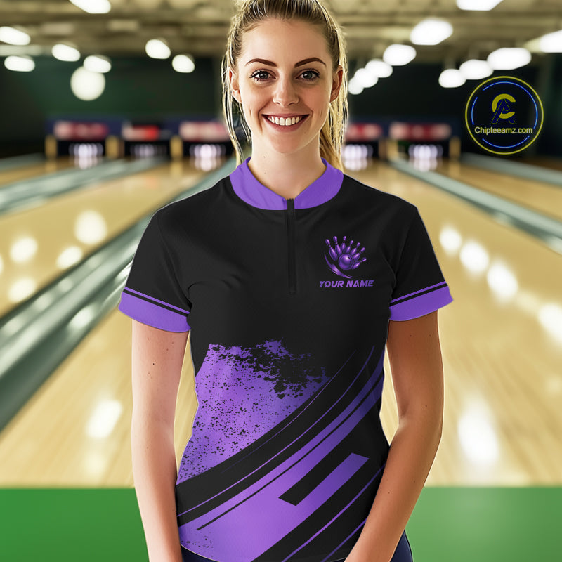 Custom Black And Purple Bowling Team Polo, Quarter-Zip Shirts For Women, Personalized Bowling Jerseys NQS10541