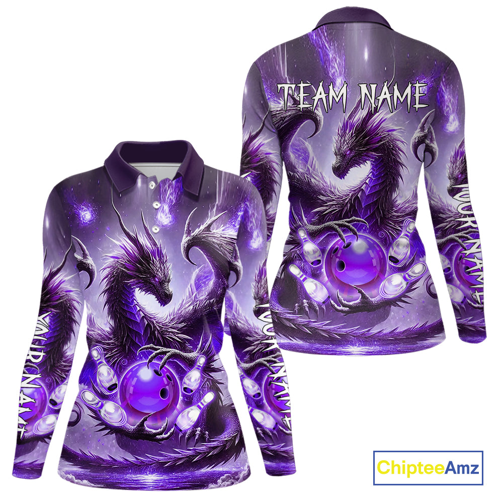 Personalized Purple Lights Dragon Women Bowling Polo, 1/4 Zip Shirt Custom Team Bowling League Jersey NQS10200