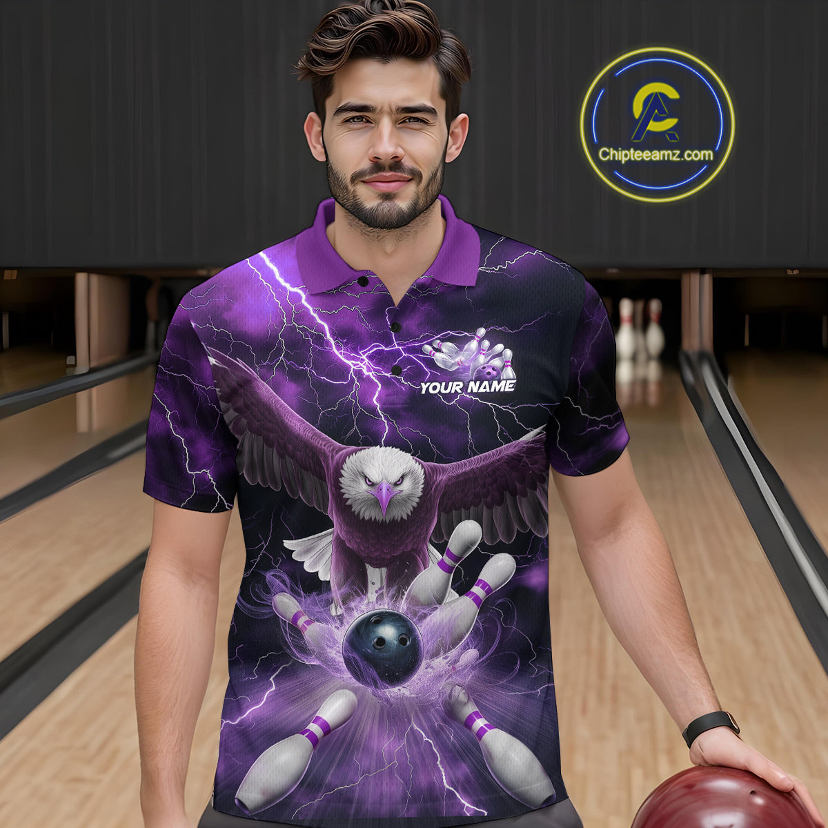 Custom Purple Thunder Lightning Eagle Bowling Polo Shirts For Men, Eagle Bowling Jerseys IPHW9365