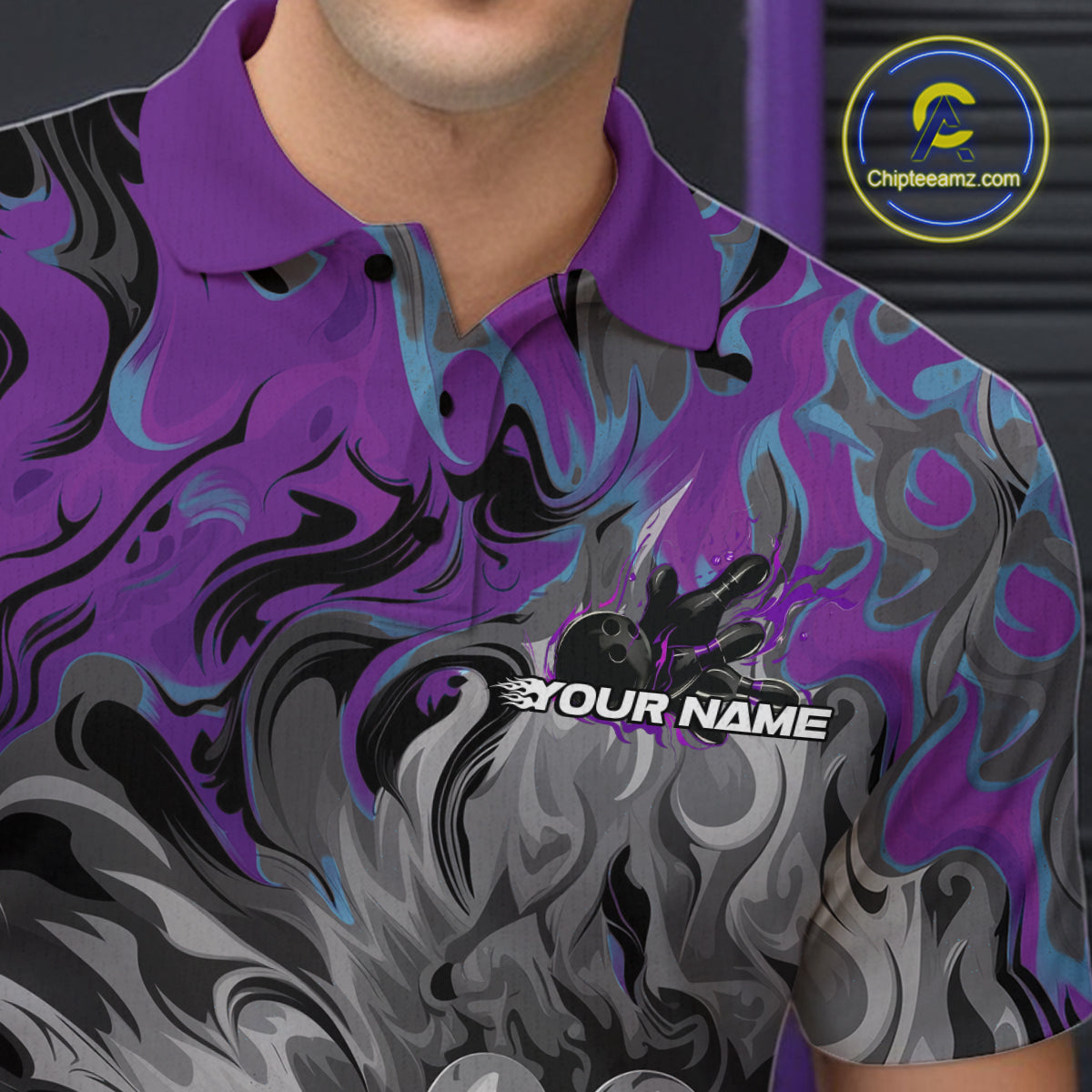 Custom Blue And Purple Fame Bowling Team Polo Shirts For Men, Fire Bowling Jerseys IPHW9559