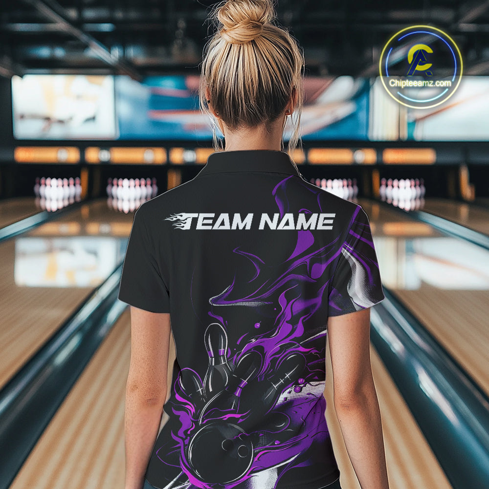 Custom Black And Purple Camo Flame Bowling Team Polo Shirts For Women, Bowling Jerseys IPHW9879