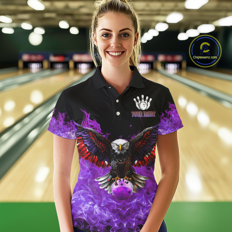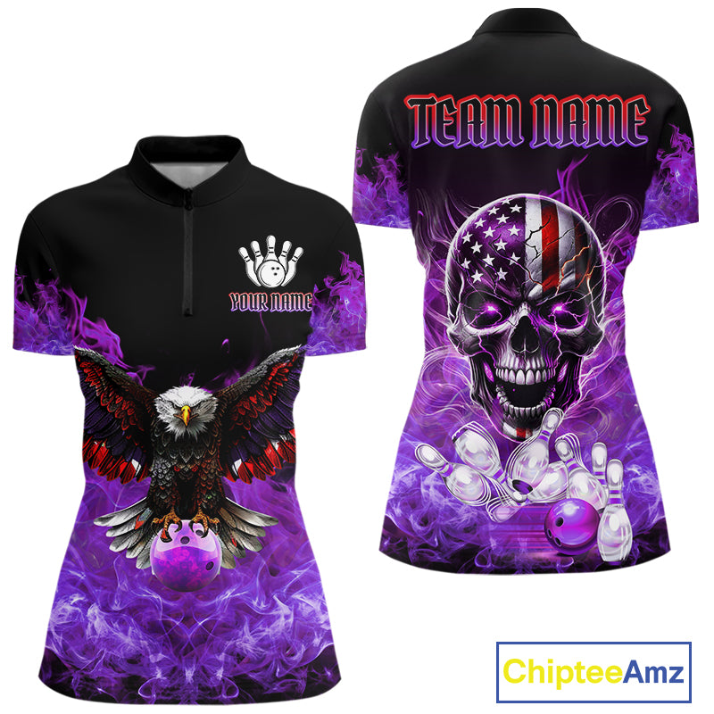 Purple Flame Smoke American Flag Eagle Skull Women Bowling Shirt Custom Patriotic Bowling Team Jersey NQS10525