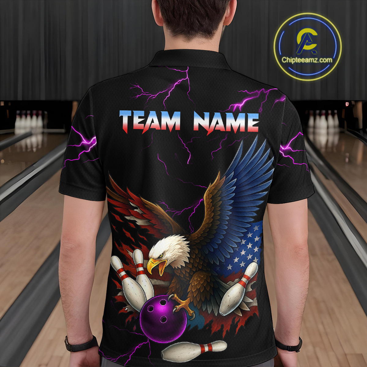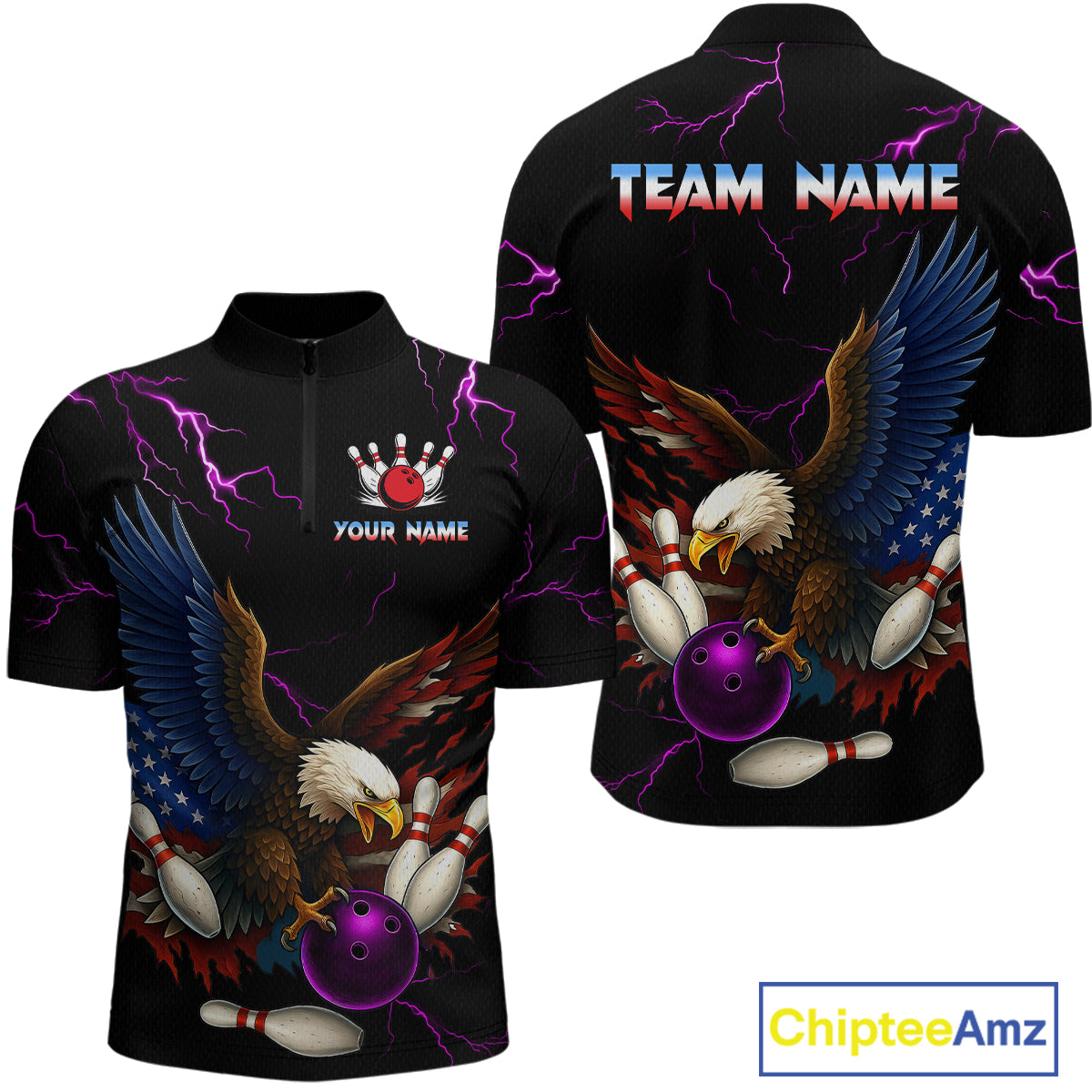 Purple Thunder US Flag Eagle Bowling Shirts for Men Team Bowling Polo & Quarter-Zip HNT96