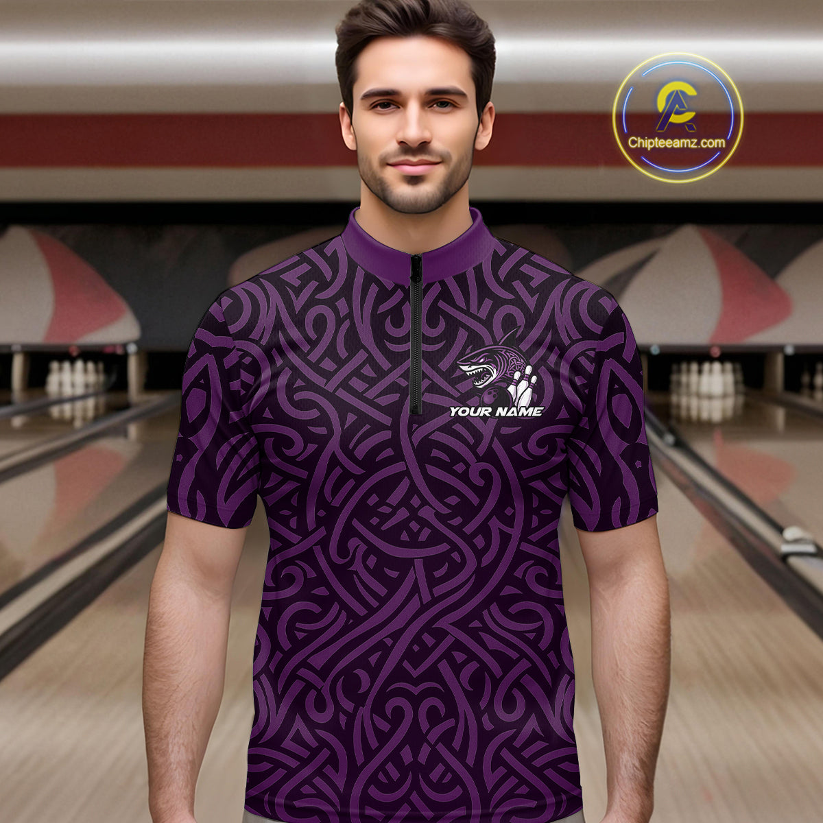 Custom Purple Tribal Shark Bowling Team Men Quarter-Zip Shirt, Shark Bowling Tournament Shirt IPHW10178