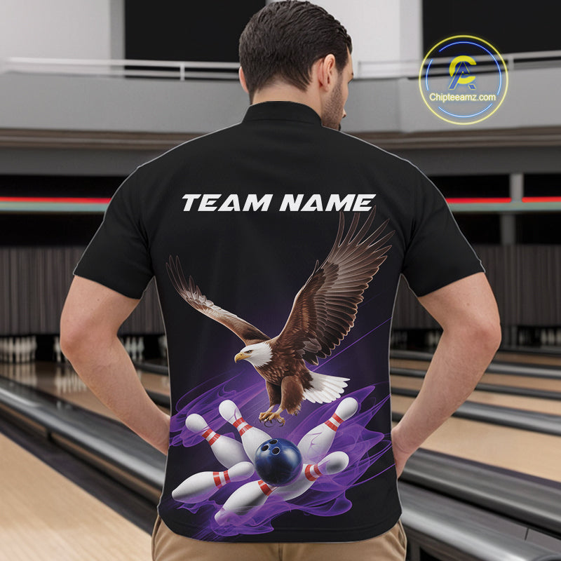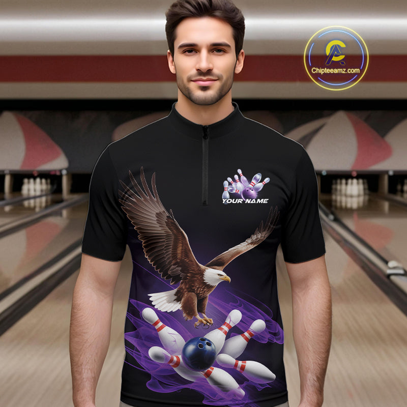 Custom Purple Flame Eagle Bowling Team Quarter-Zip Shirts For Men, Bowling Tournament Shirt IPHW9369