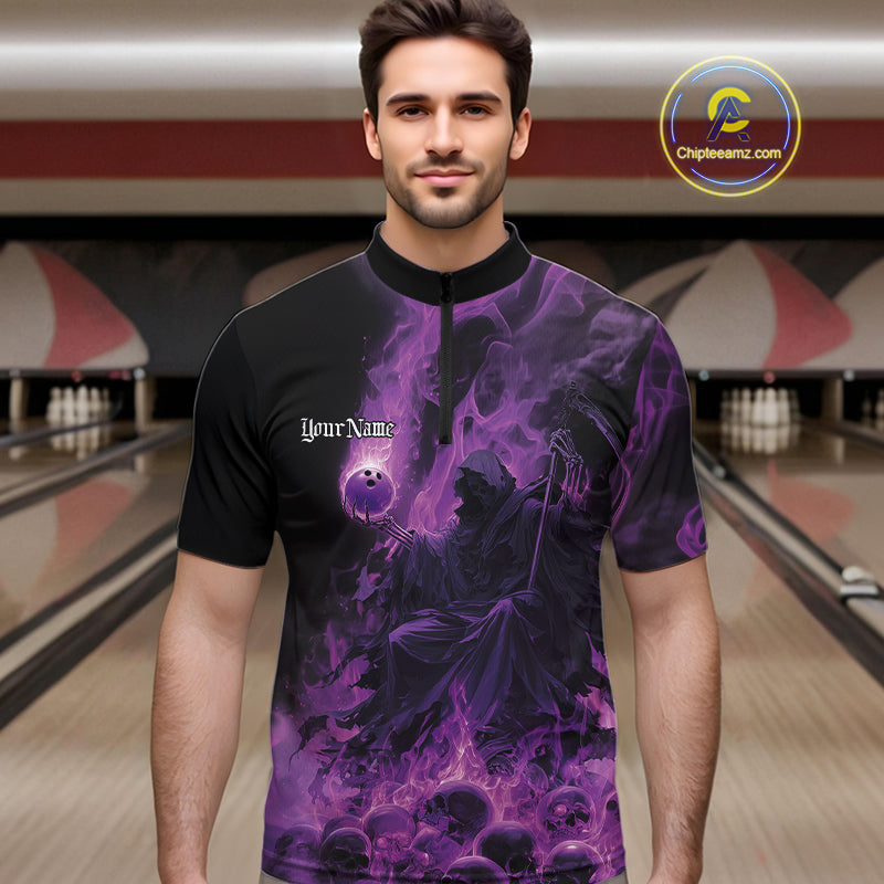 Custom Purple Flame Skull Bowling Quarter-Zip Shirts, Purple Smoke Bowling Hallween Outfit IPHW9470