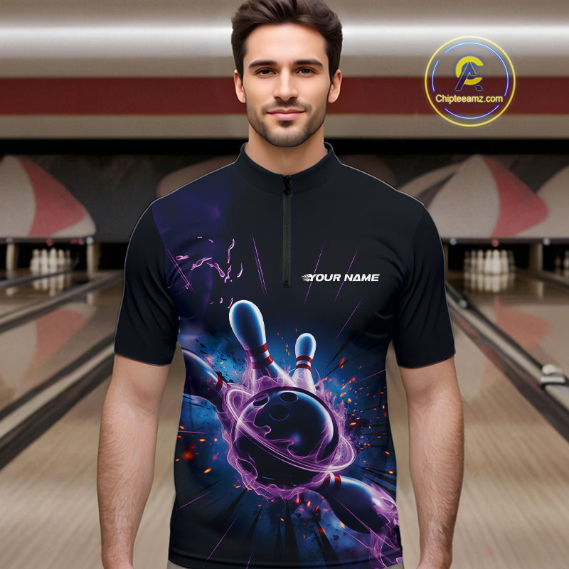 Custom Galaxy Blue And Purple Flame Bowling Men Quarter-Zip Shirt , Bowling League Team Uniform IPHW9568