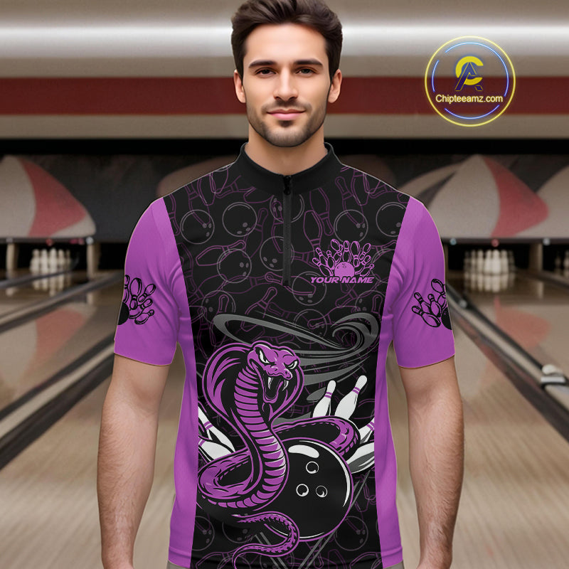 Custom Purple Cobra Snake Bowling Team Men Quarter-Zip Shirts, Bowling Pattern Shirt IPHW9705