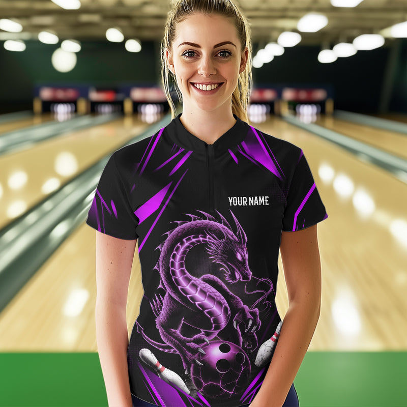 Custom Black And Purple Dragon Women Bowling Quarter-Zip Shirt, Dragon Bowling League Shirt IPHW8673