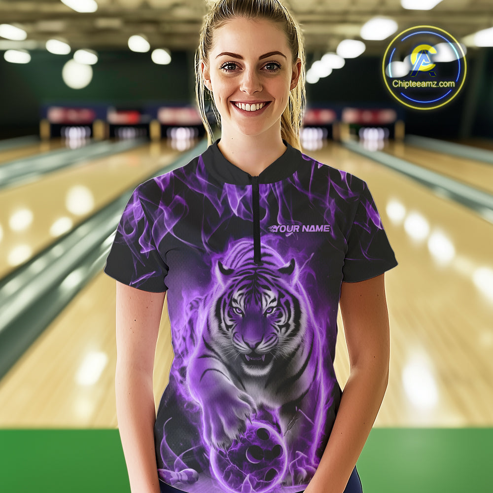 Custom Purple Flame Tiger Bowling Quarter-Zip Shirts For Women, Tiger Bowling Team Shirt IPHW9761