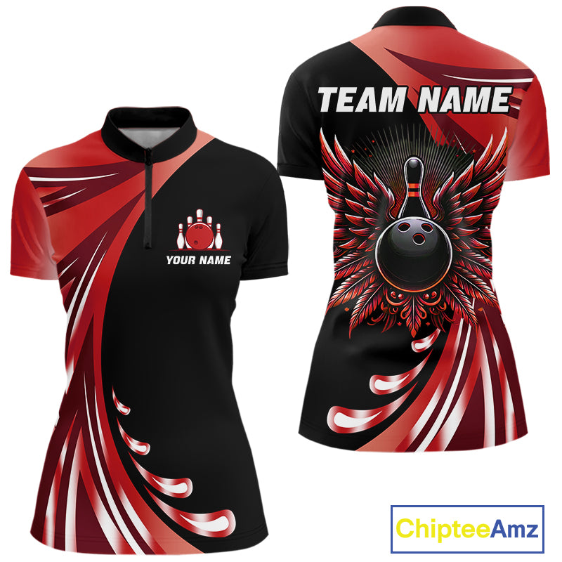Black and Red Bowling Ball and Pins wings Bowling Shirts for Women Custom Team Bowling Jerseys NQS10491