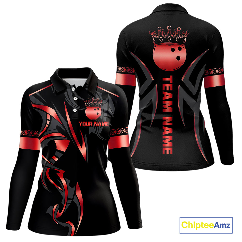 Black and Red crown Bowling ball Polo, Quarter Zip Shirts for Women Custom Bowling Team jerseys NQS10047