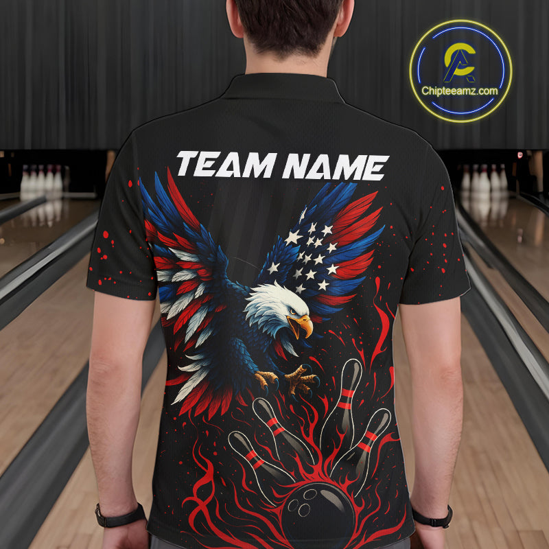 Black and Red Flame American Flag Eagle Bowling Shirts For Men Custom Patriotic Bowling Team Jersey NQS10878