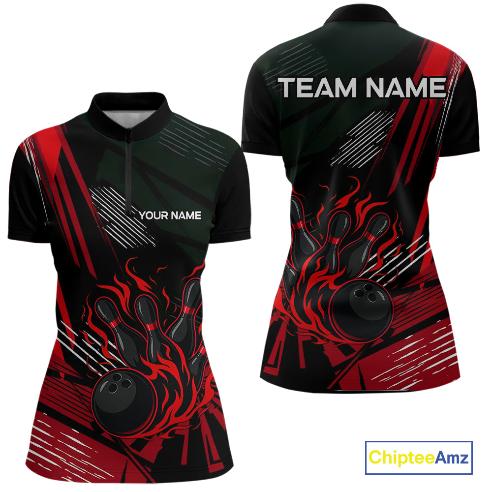 Black and Red Flame Bowling Polo, Quarter Zip Shirts For Women Custom Bowling Outfit Team Jerseys NQS10192
