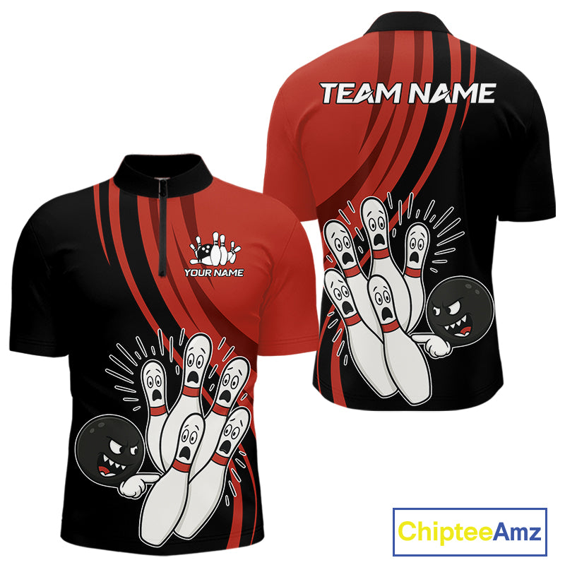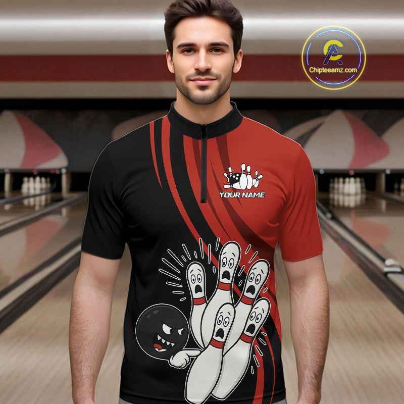 Funny Bowling ball and pins Black and Red Bowling Team Shirts For Men Custom Retro Bowling Jerseys NQS10225