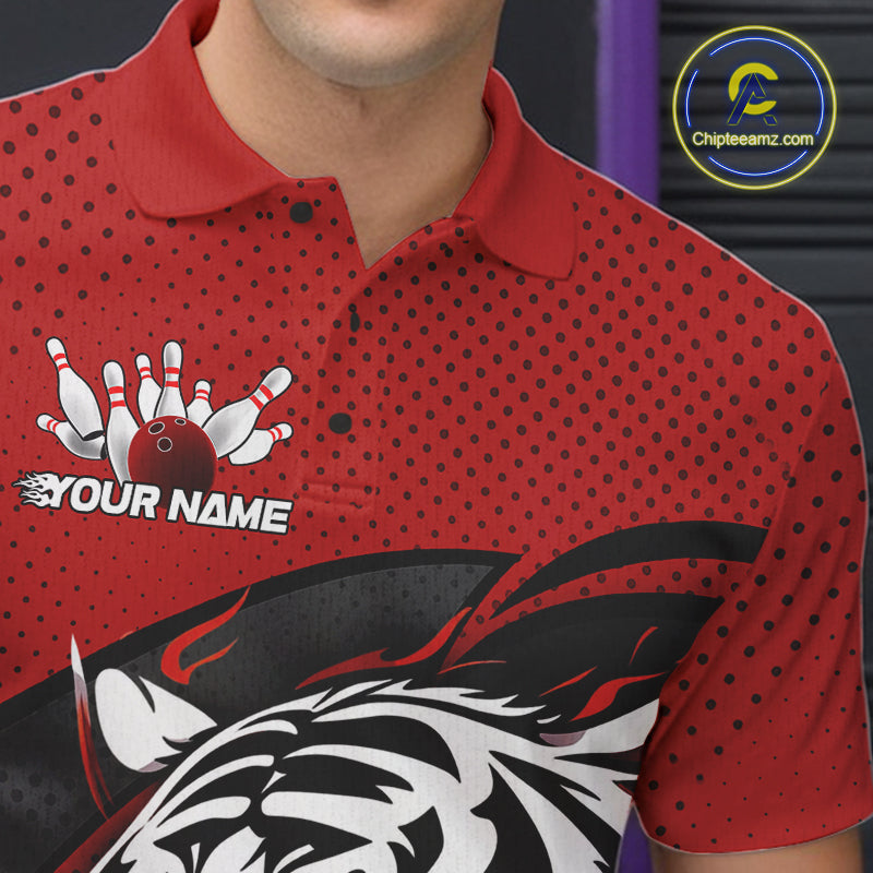 Custom Black And Red Tiger Bowling Team Polo Shirts For Men, Bowling League Shirt IPHW9019