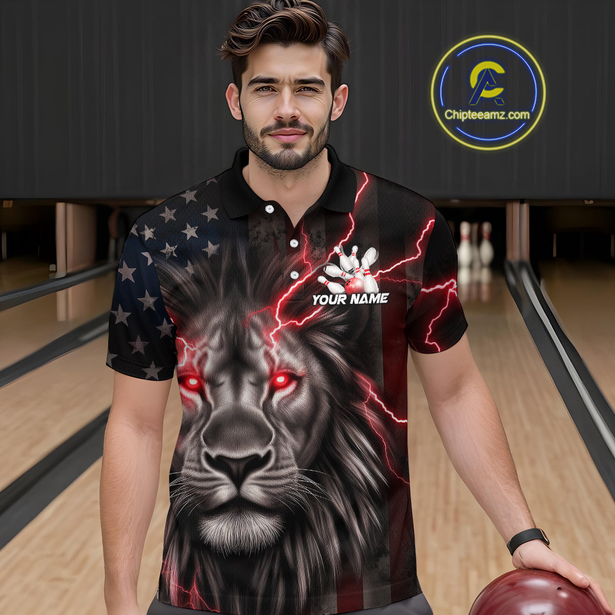 Custom Red Thunder Lightning Patriotic Lion Polo Shirts For Men, US Flag Bowling Jerseys IPHW9319