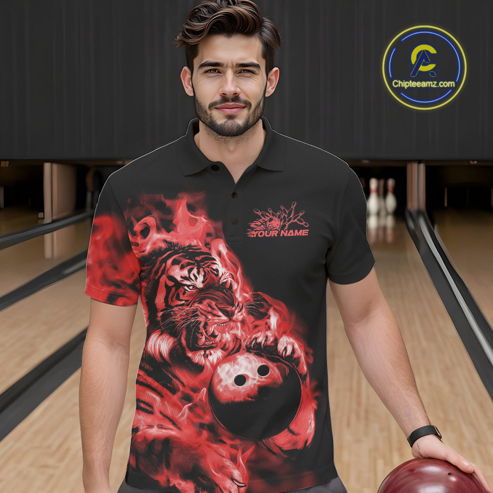 Custom Red Fire Flame Tiger Bowling Jerseys, Bowling Team Men Polo Shirts IPHW9488