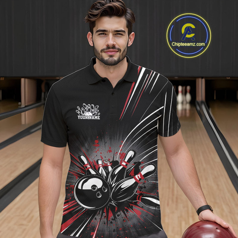 Custom Black And Red Grunge Bowling Team Jerseys, Men Bowling Polo Shirts IPHW9620