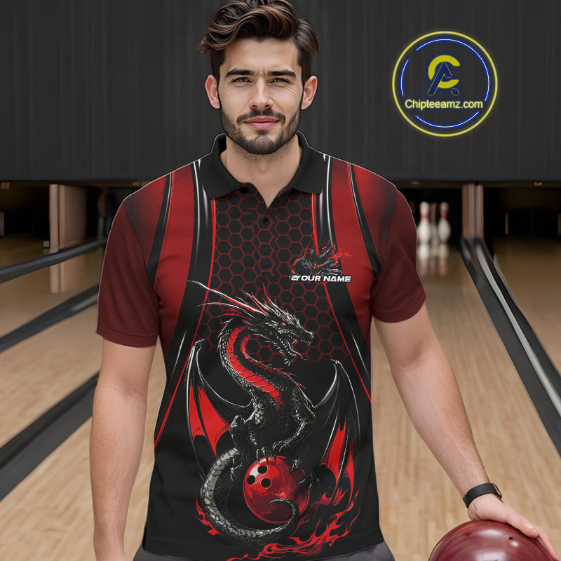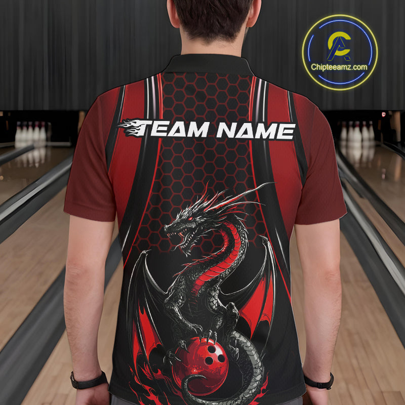 Custom Black And Red Flame Dragon Bowling Jerseys, Dragon Bowling Team Men Polo Shirt IPHW9905