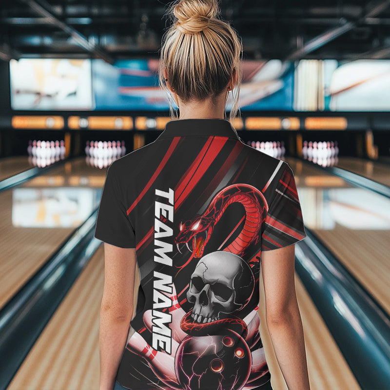 Custom Black And Red Snake Skull Bowling Polo Shirts For Women, Bowling Team Shirt IPHW8670