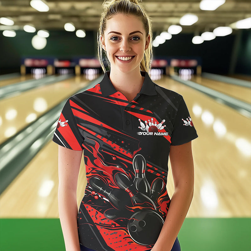 Custom Black And Red Flame Women Bowling Polo Shirts, Fire Bowling Ball Bowling Team Shirt IPHW8697