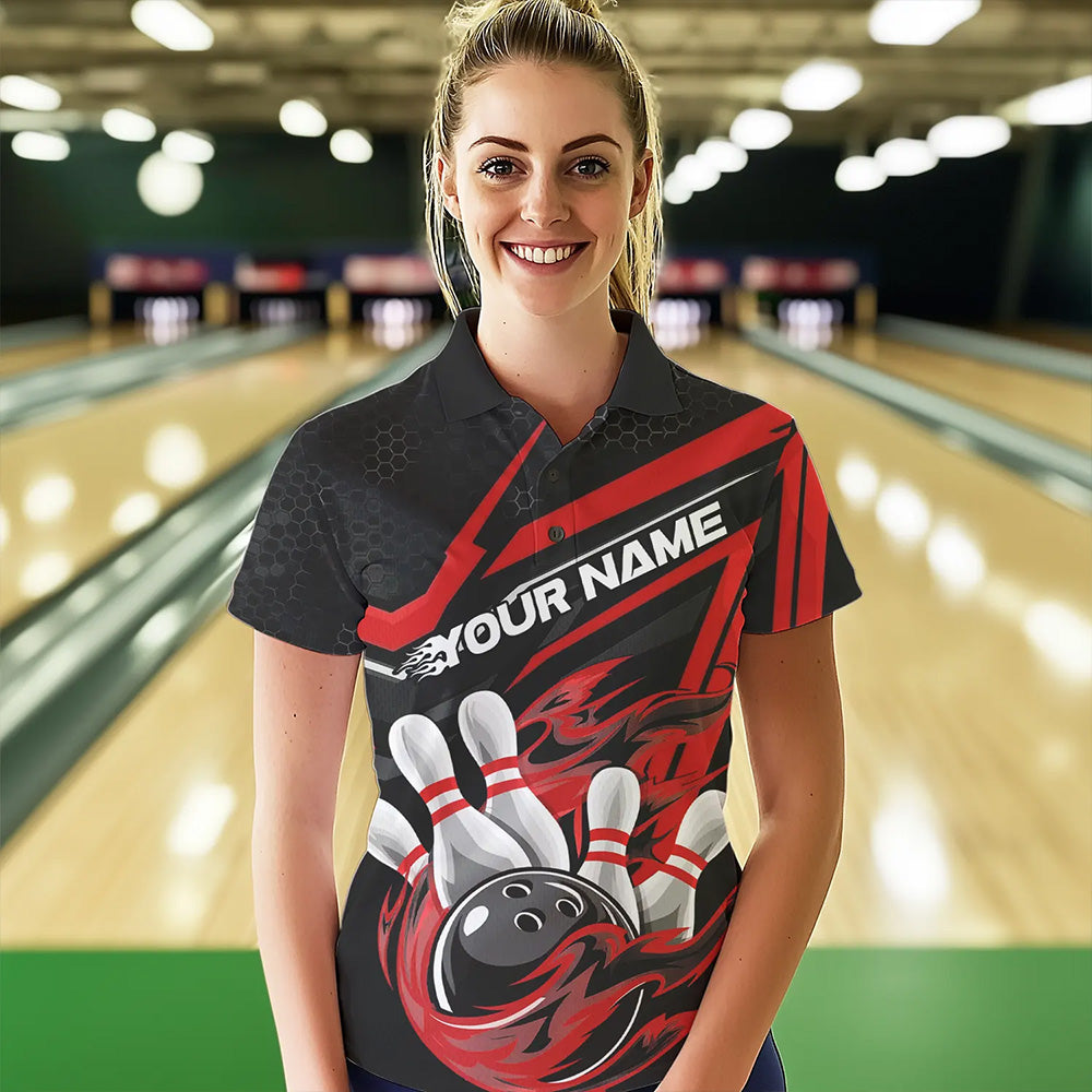 Custom Black And Red Flame Bowling Team Polo Shirts For Women, Fire Bowling League Shirt IPHW8768