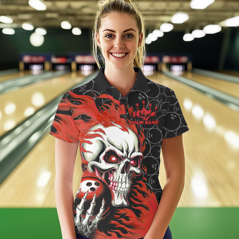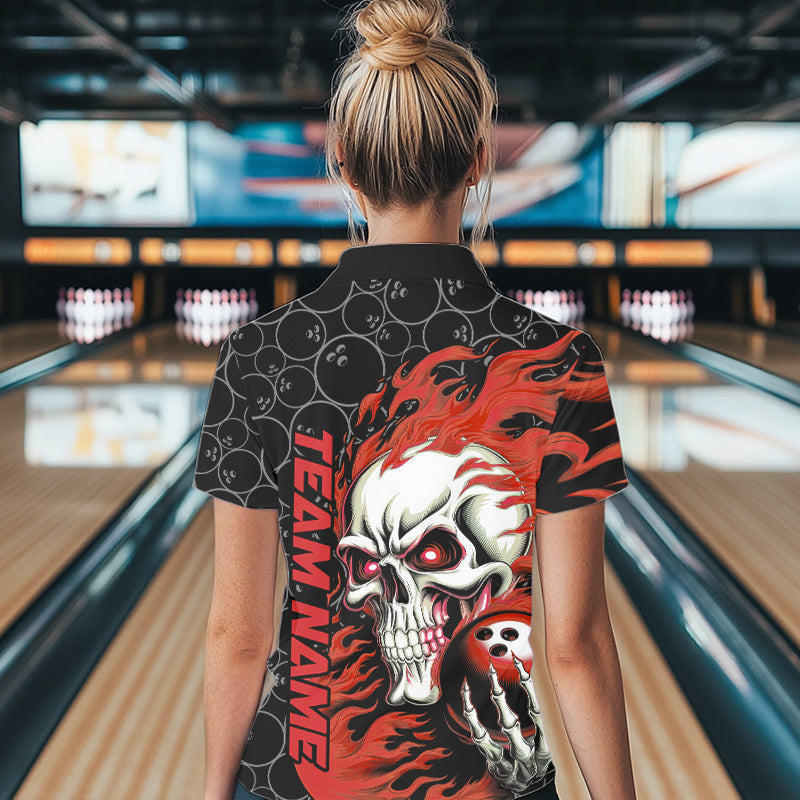 Custom Black And Red Flame Skull Bowling Women Polo Shirts, Skull Halloween Bowling Outfit IPHW8777