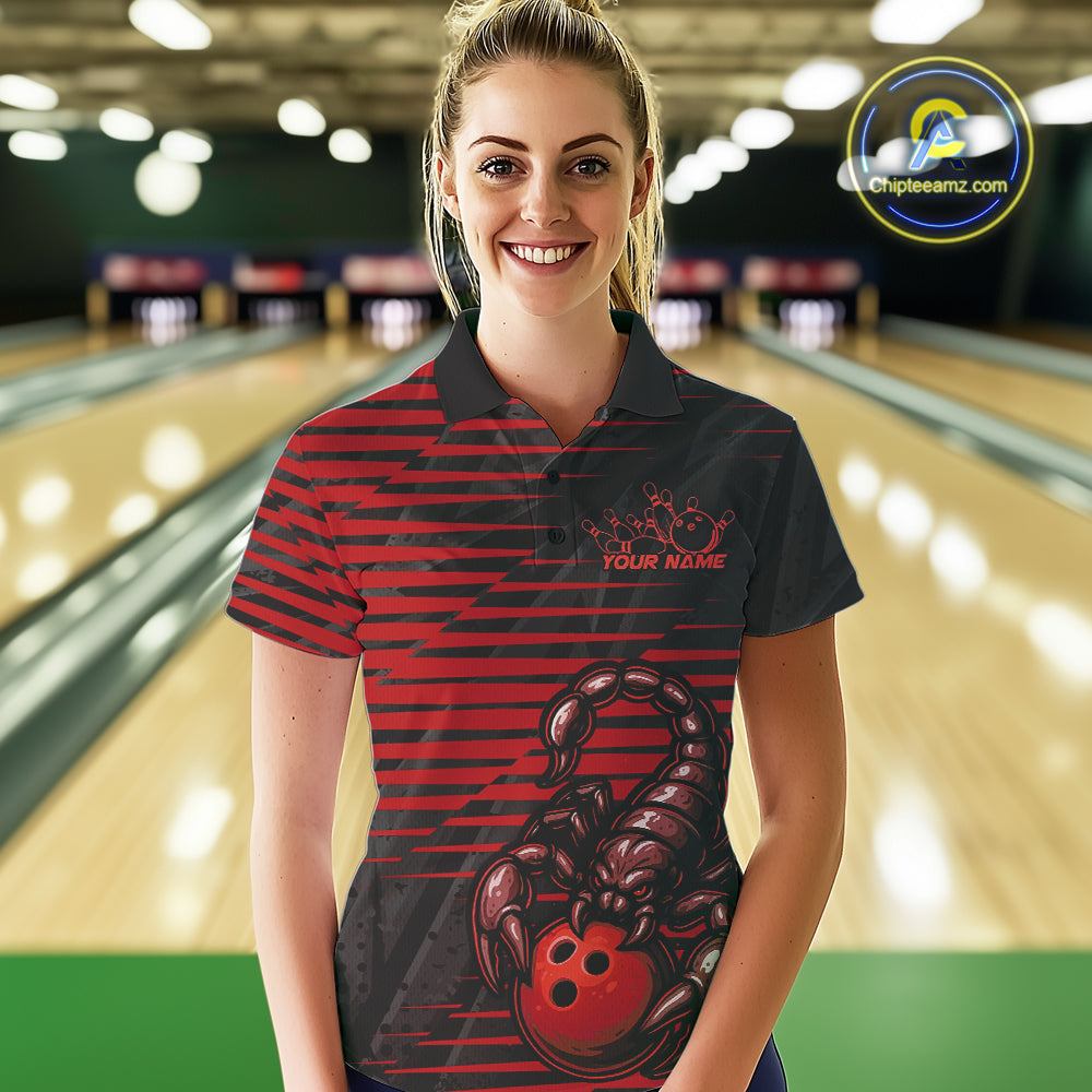Custom Black And Red Scorpion Bowling Team Polo Shirts For Women, Bowling League Shirt IPHW9036