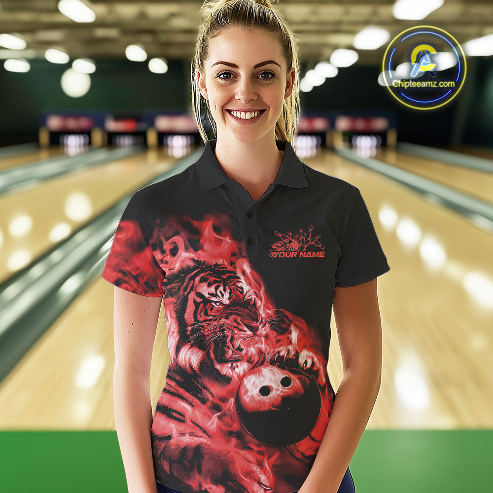 Custom Red Fire Flame Tiger Bowling Jerseys, Bowling Team Women Polo Shirts IPHW9488