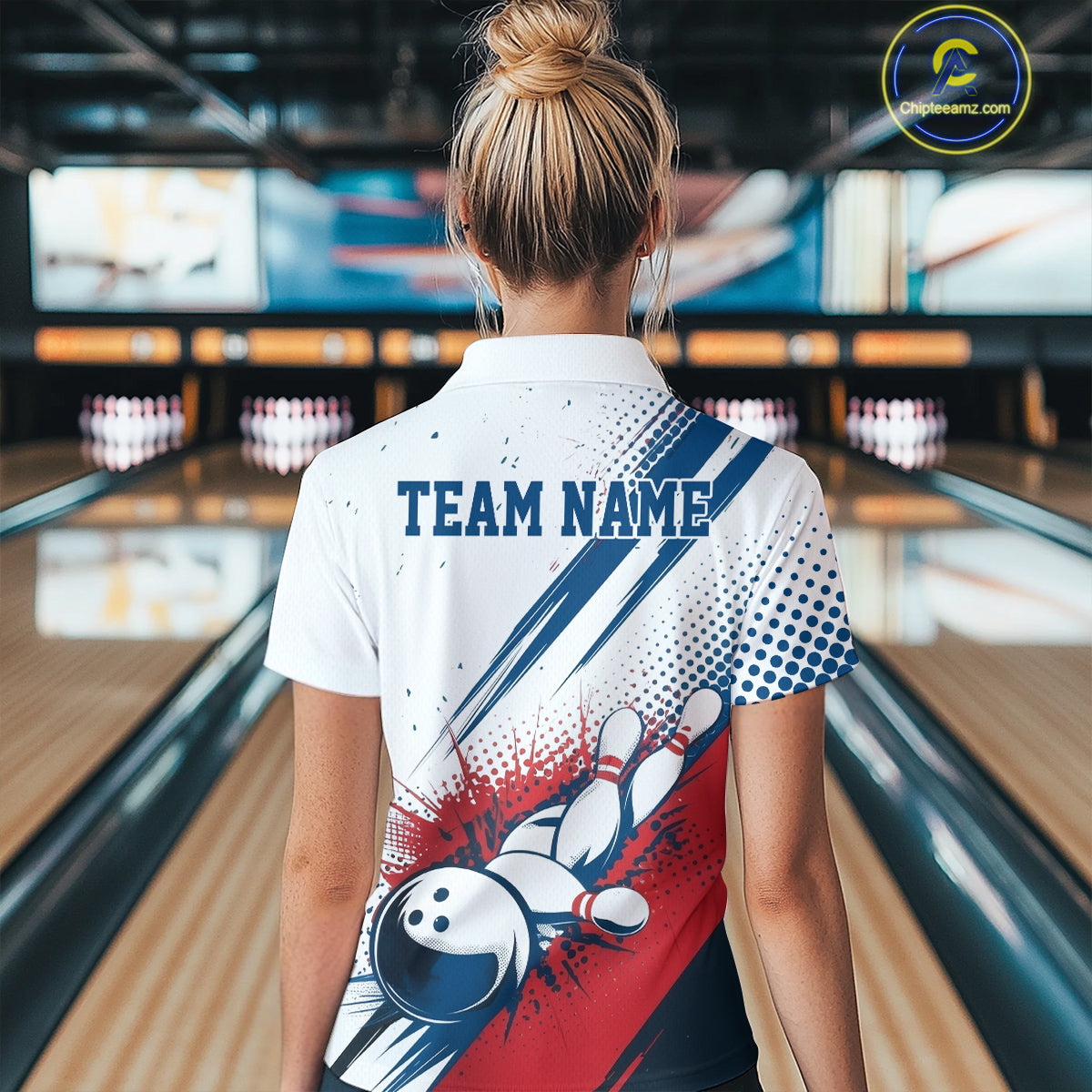 Custom Red, White And Blue Patriotic US Flag Bowling Polo Shirts For Women, Team Uniform IPHW9542