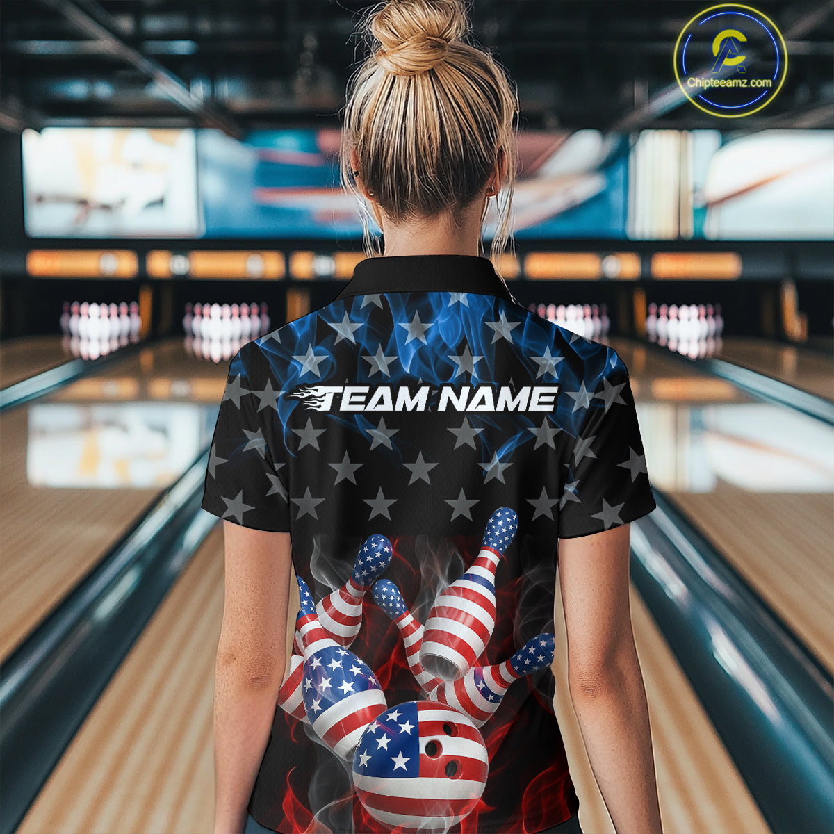 Custom Red And Blue Flame American Flag Patriotic Bowling Women Polo Shirts, Team Uniform IPHW9716