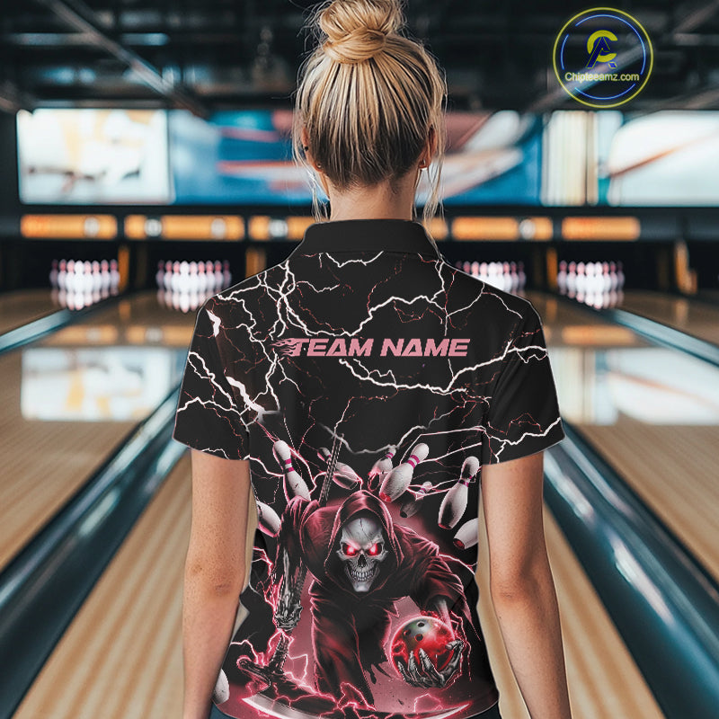 Custom Black And Red Lightning Grim Reaper Bowling Women Polo Shirt, Halloween Outfit IPHW9802