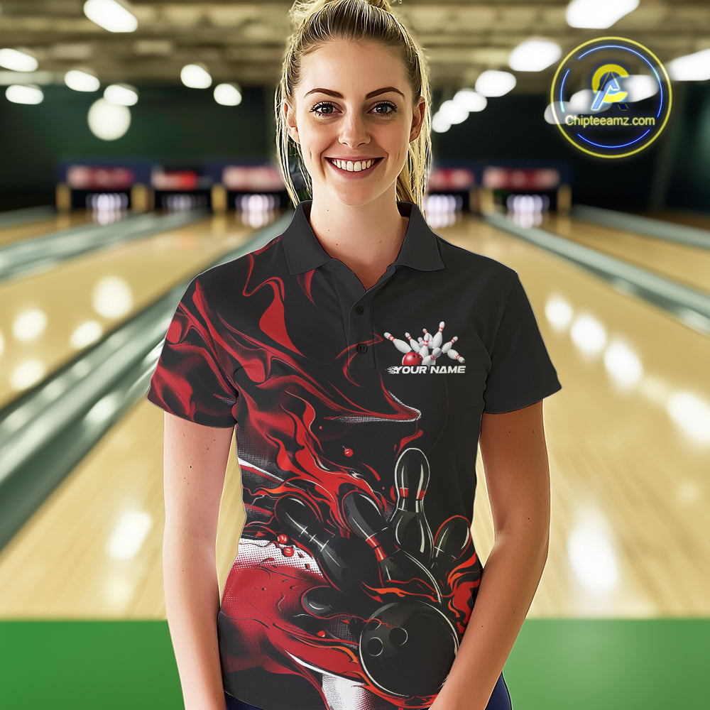 Custom Black And Red Camo Flame Bowling Team Polo Shirts For Women, Bowling Jerseys IPHW9877