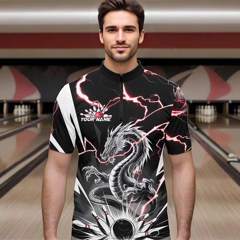 Custom Black And Red Thunder Lightning Dragon Bowling Team Quarter-Zip Shirts For Men IPHW8556