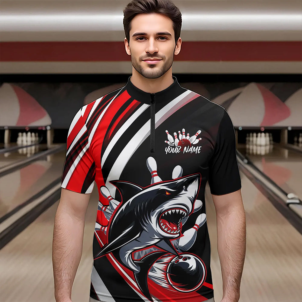 Custom Black And Red Shark Bowling Quarter-Zip Shirts For Men, Shark Bowling Team Jerseys IPHW8722