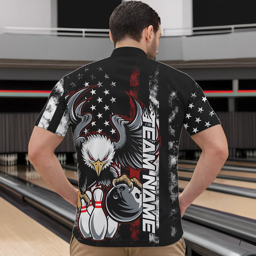 Custom Red Thin Line American Flag Eagle Bowling Men Quarter-Zip Shirts, Patriotic US Bowling Shirt IPHW8736