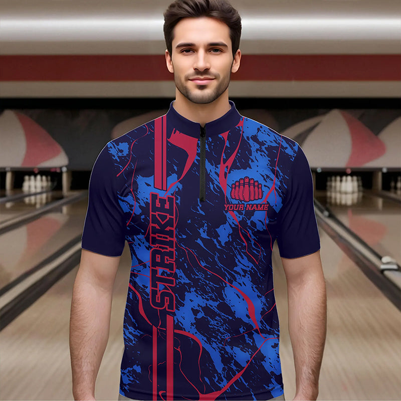 Custom Blue And Red Strike Bowling Quarter-Zip Shirts For Men, Bowling League Team Uniform IPHW8858