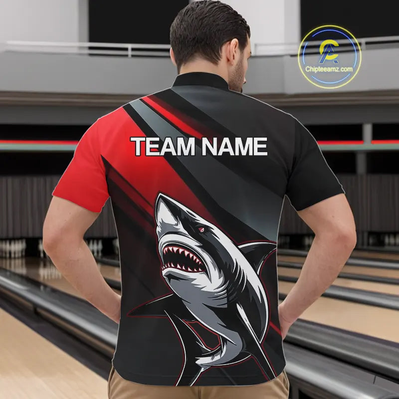 Custom Black And Red Shark Bowling Jerseys, Bowling Team Uniform Shark Men Quarter-Zip Shirts IPHW8999
