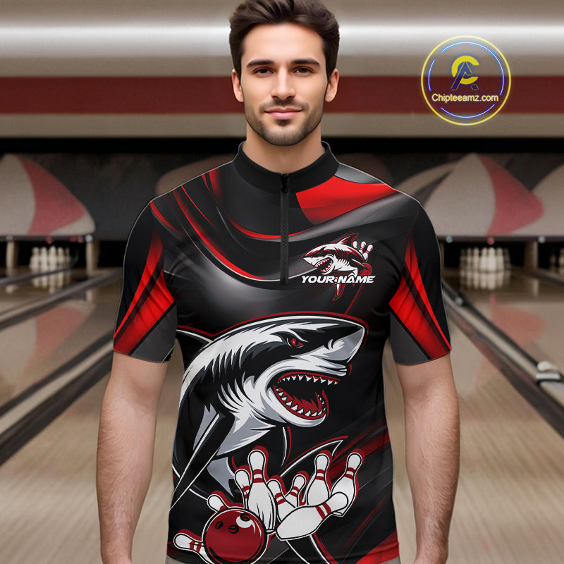 Custom Black And Red Shark Bowling Team Quarter-Zip Shirts For Men, Bowling League Shirt IPHW9002