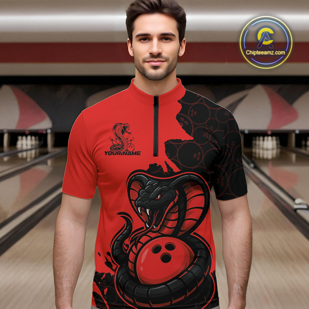 Custom Black And Red Cobra Snake Bowling Men Quarter-Zip Shirts Team Uniform Bowling Pattern IPHW9032