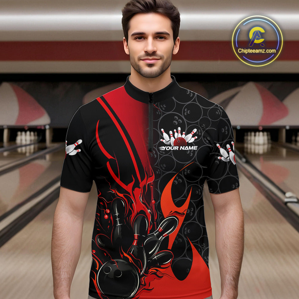 Custom Red Flame Bowling Pattern Bowling Men Quarter-Zip Shirt, Bowling Team League Shirt IPHW9881