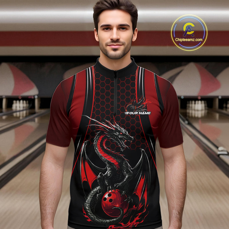 Custom Black And Red Flame Dragon Bowling Jerseys, Dragon Bowling Team Men Quarter-Zip Shirt IPHW9905