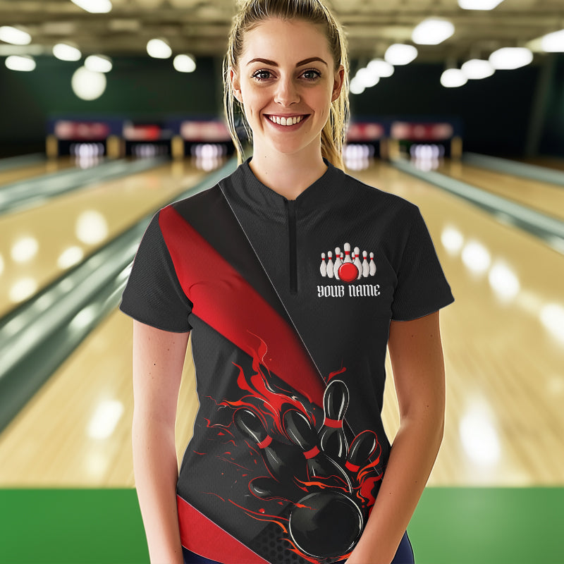 Custom Black And Red Flame Duckpin Bowling Women Quarter-Zip Shirts, Tournament Outfit IPHW8945