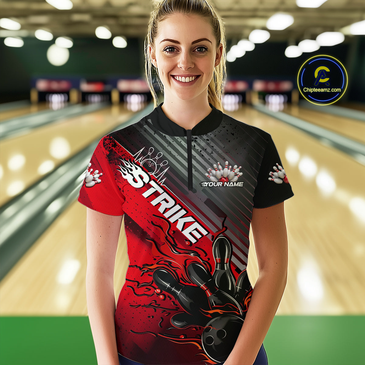 Custom Red Strike Flame Bowling Women Quarter Zip Shirt, Bowling Team Shirt Bowler Outift IPHW9615