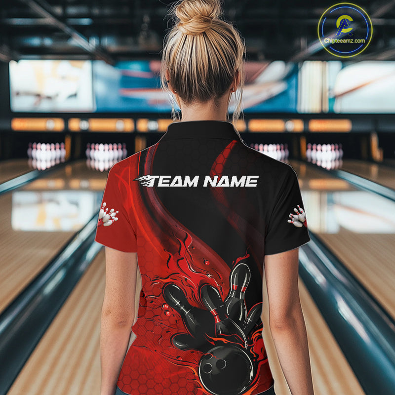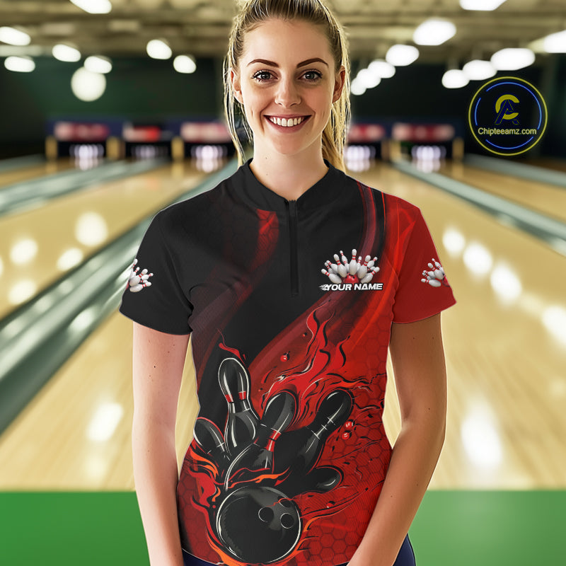 Custom Black And Red Flame Bowling Quarter-Zip Shirt For Women, Bowling Team League Shirt IPHW9872