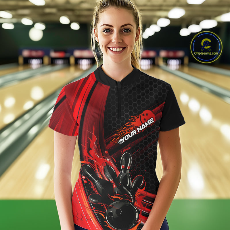 Custom Black And Red Flame Bowling Jerseys, Bowling Team Quarter-Zip Shirts For Women IPHW9884