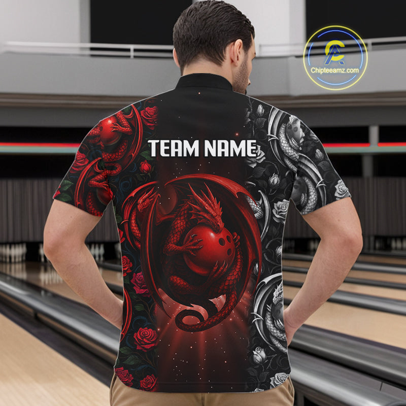 Red Dragon Roses Pattern Custom Bowling Polo, Quarter Zip shirts For Men, Dragon Bowling League Shirt NQS10626
